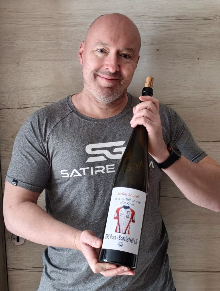 Stefan Soucek, allen aber nur als Sushi bekannt, feierte am 19. Februar seinen 50 Geburtstag. Sushi war über viele Jahre ein aktives Mitglied bei der RSG. Vielen sind sicherlich seine toll geschriebenen Erlebnisberichte noch in Erinnerung, z.B. sein Bericht über Paris-Roubaix, wo er die Farben der RSG vertrat. Auch bei jeden „Trainingslager“ war er dabei und wir hatten viele schöne und lustige Stunden. Leider ist er dem Radsport etwas „abhanden“ gekommen. Vielleicht ändert sich das ja mal wieder. Aufgrund der Entfernung – Sushi wohnt in Nordbaden – wurde er telefonisch gratuliert. Natürlich bekam er auch sein Jubiläumsfläschchen zugesendet. Das kam direkt am Geburtstag an und noch bevor ein Bild entstand „testete Sushi den guten Tropfen…… Es hat ihm gemundet.